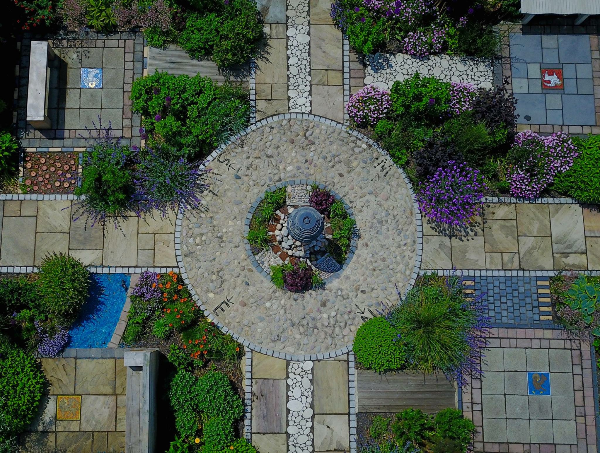 2018 Drone Shot of the Garden with Mosaics, and Supporting Haiti, Caribbean evening.